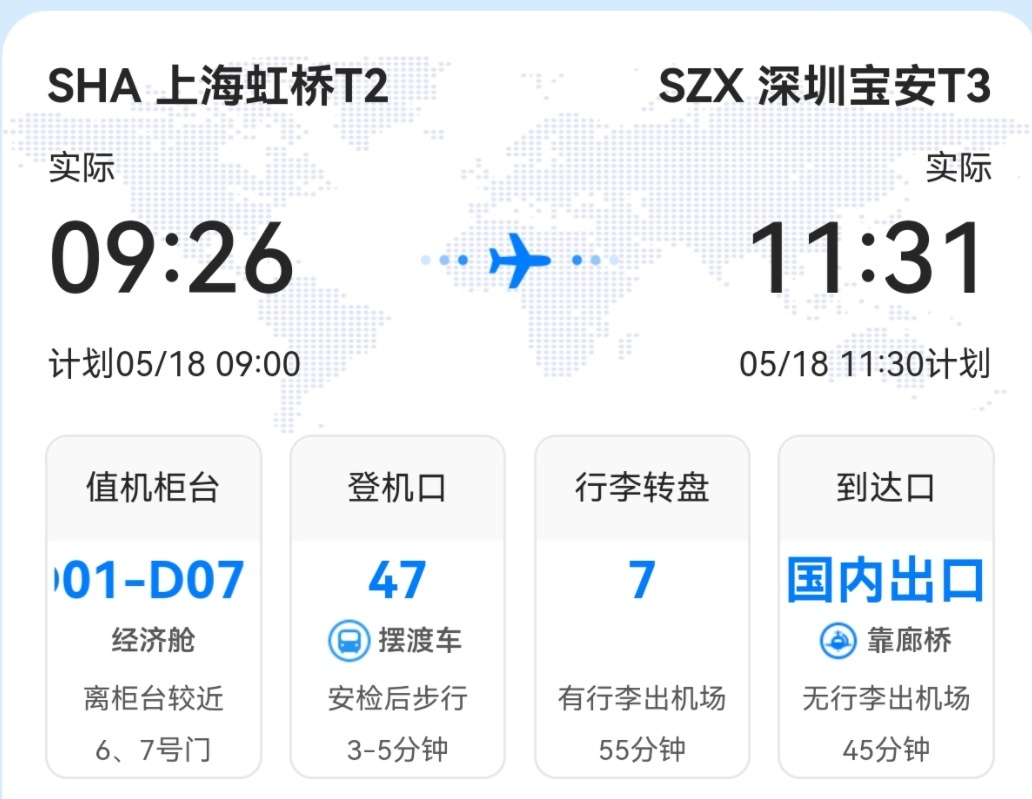 去程航班号MU5351,17:40从上海虹桥起飞,20:05抵达深圳;